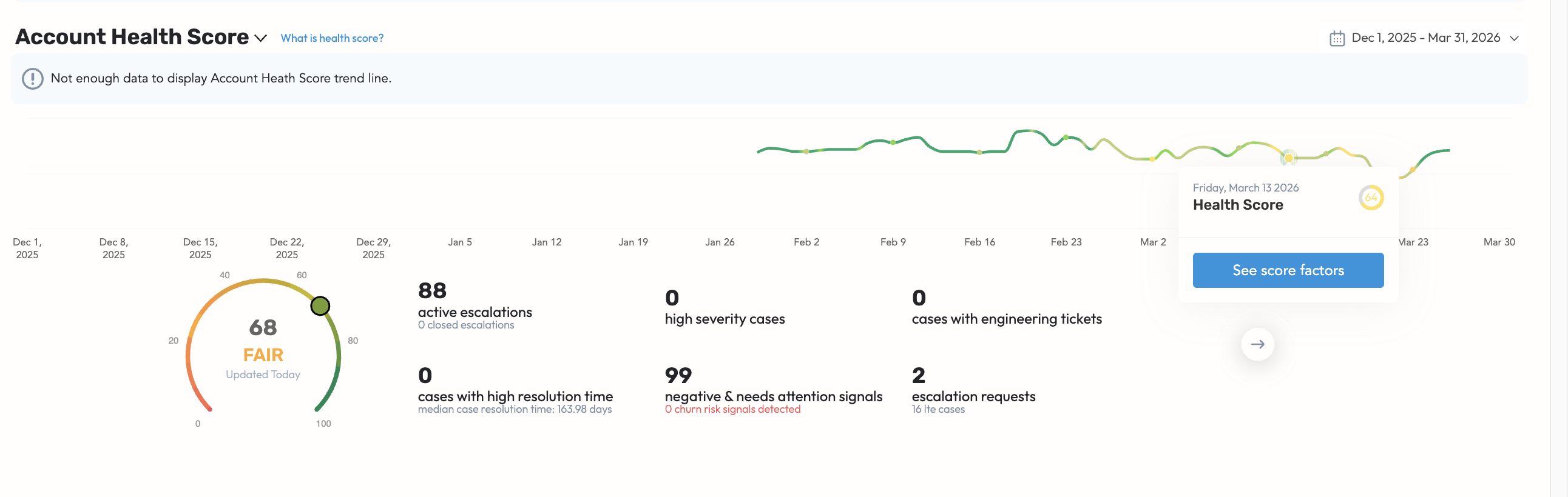Account Hub is designed to offer a comprehensive summary of an account’s overall health and support interactions. Users can view Account Health Score trends over a selected timeframe, analyze case activity, and identify key signals impacting customer experience.
